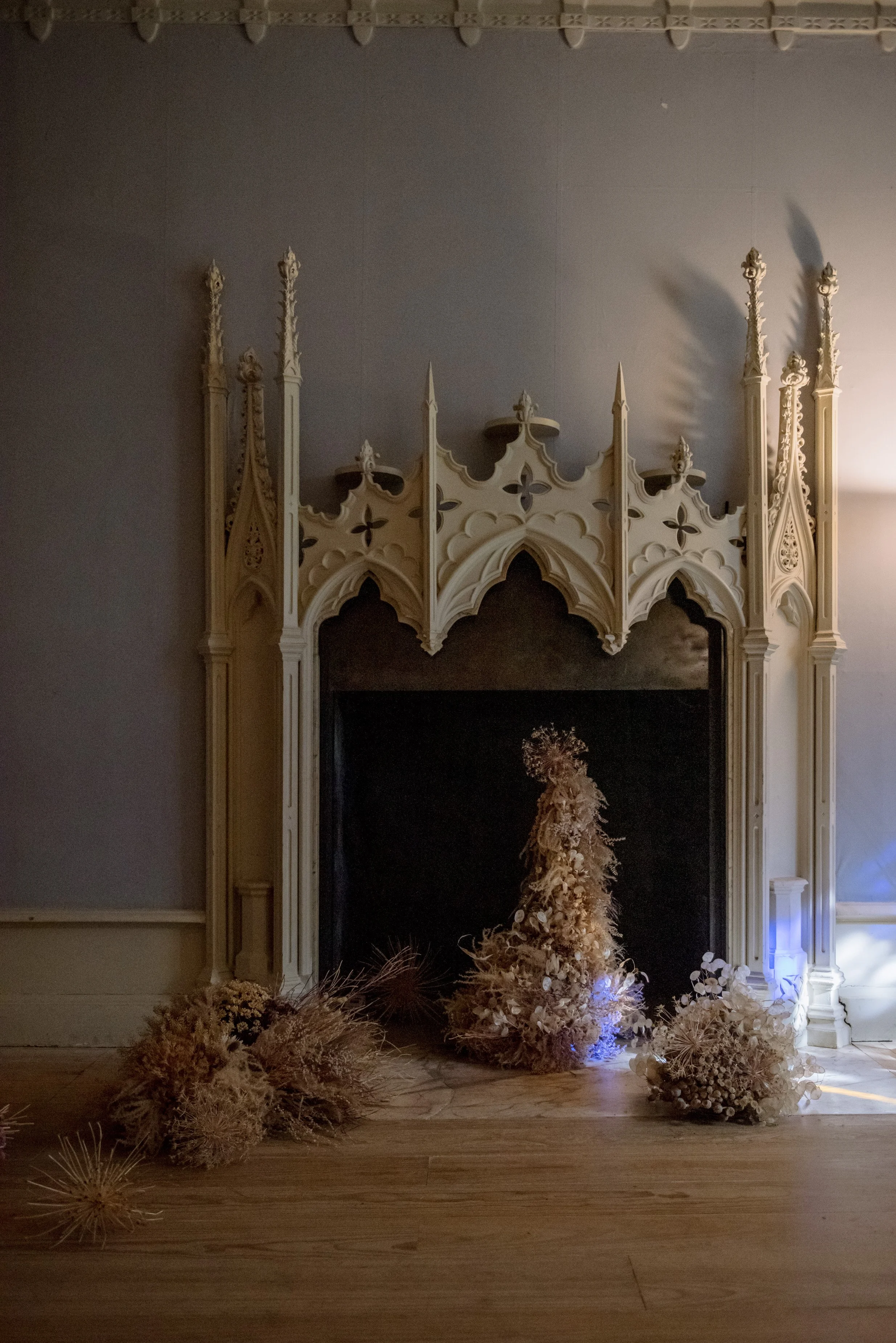 A floral Fairy Godmother installation inspired by gothic tales and Edmund Dulac, created for The National Trust.