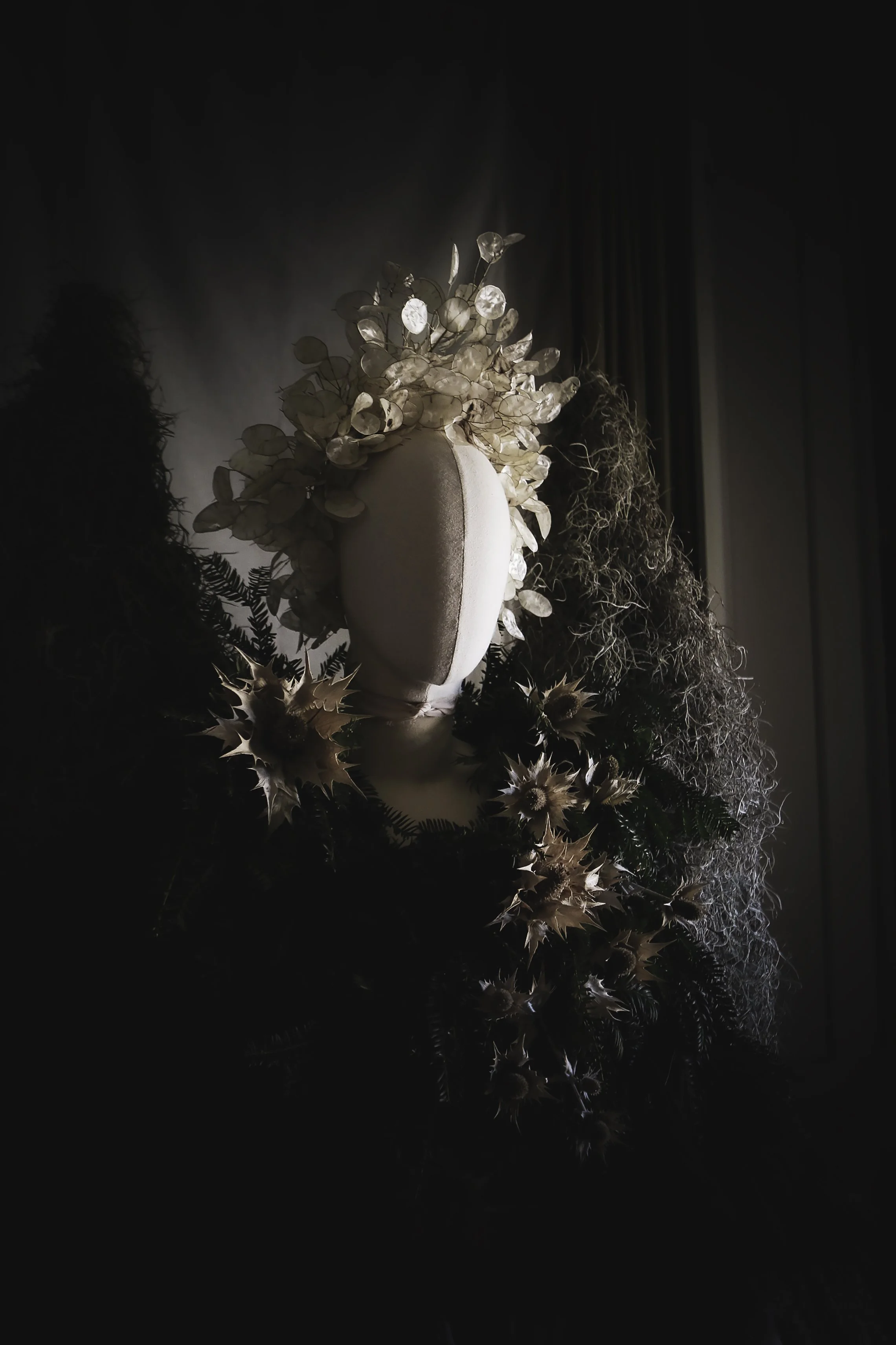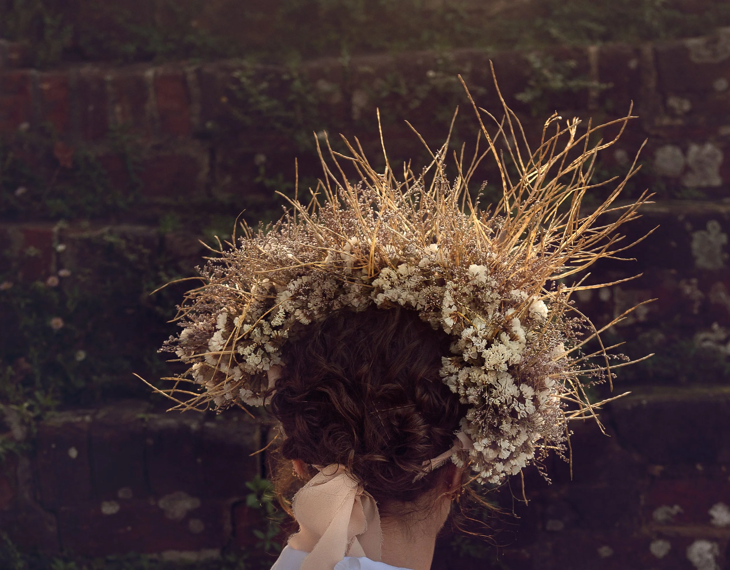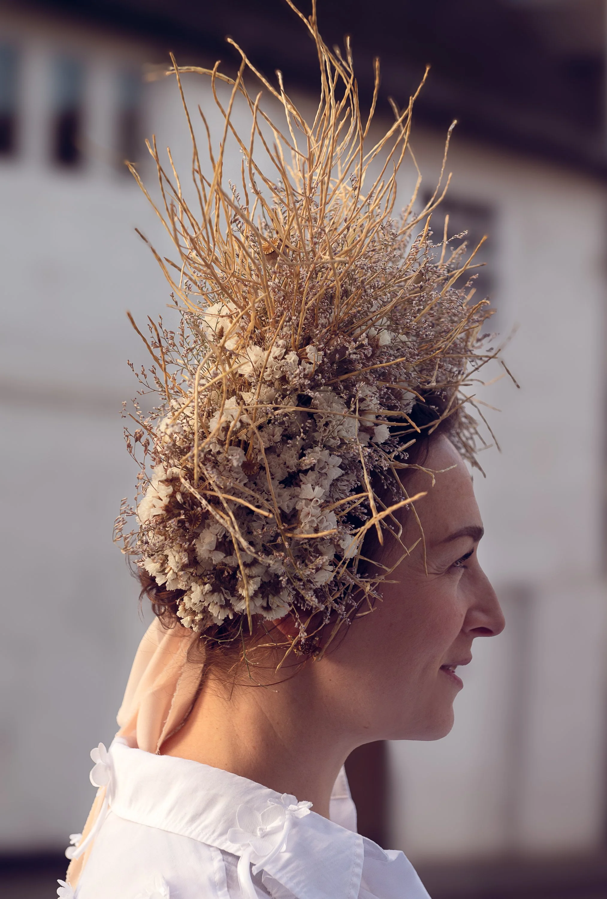 Sculptural floral headpieces, formed from dried botanicals. Composed in quiet abundance, with attention to height, balance and presence. Designed to endure.