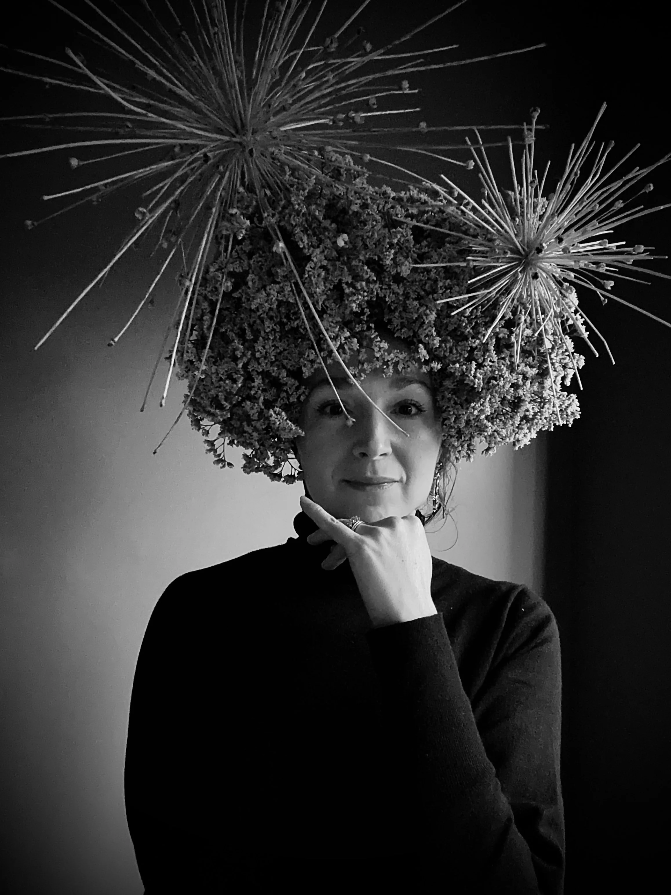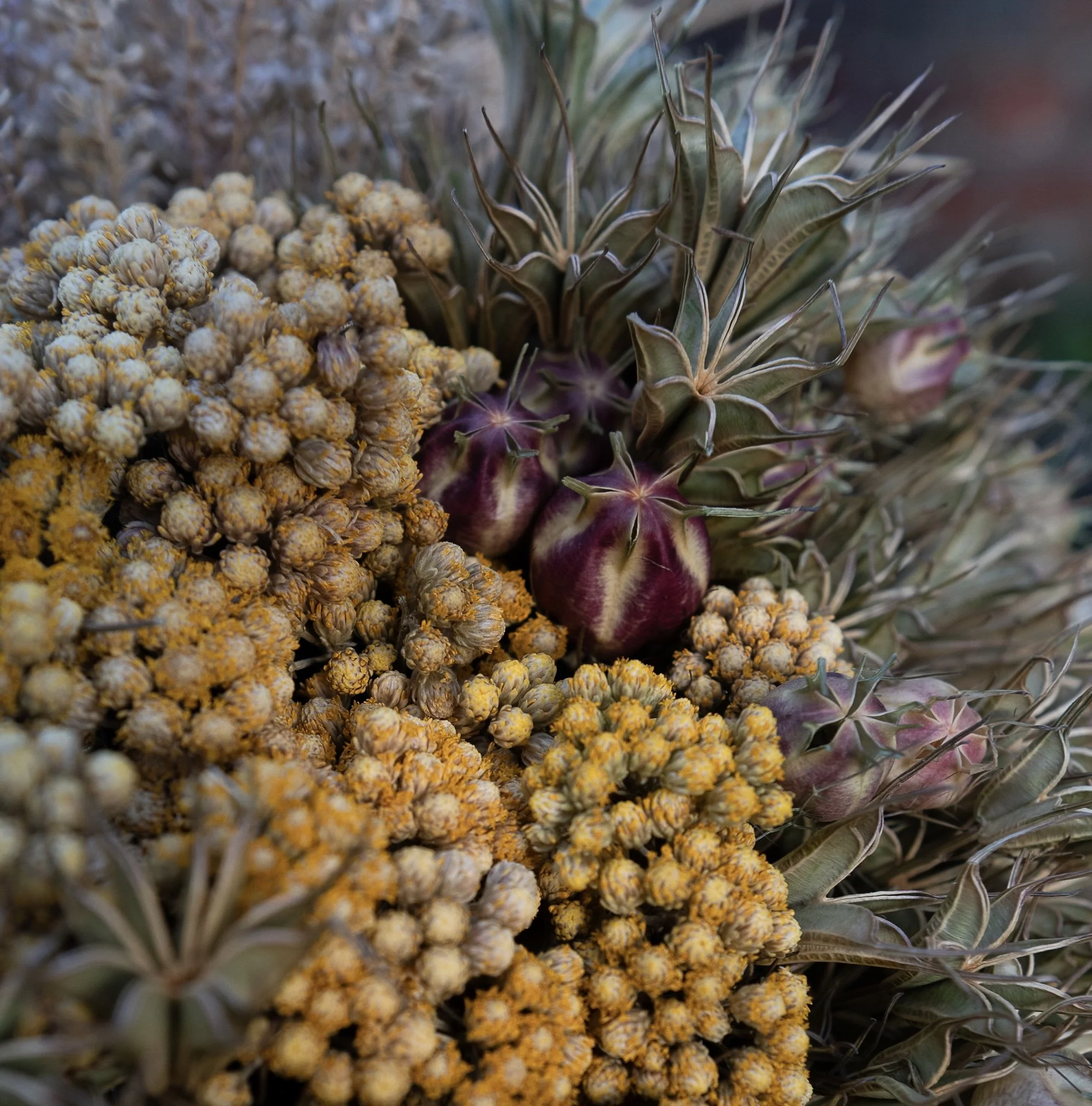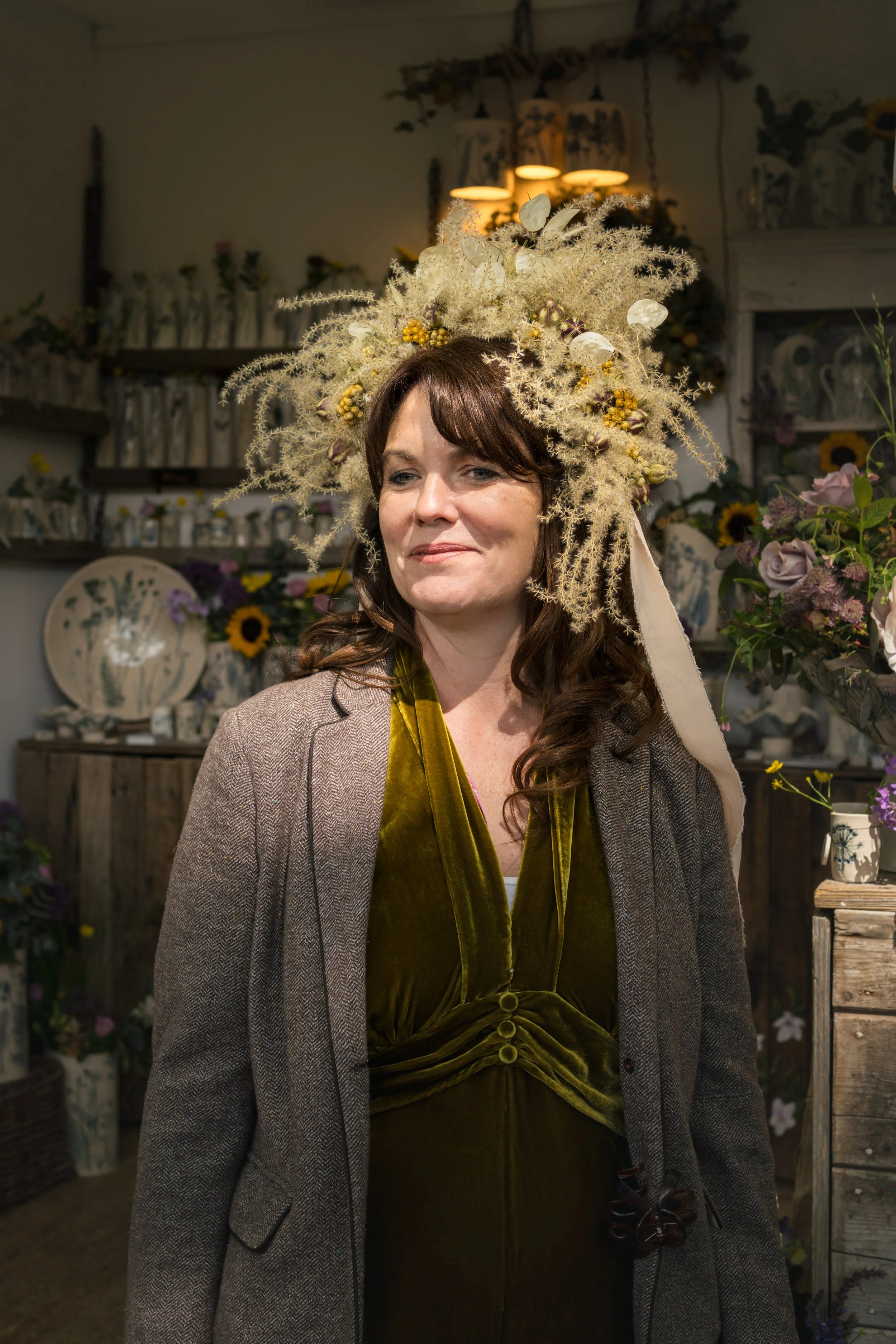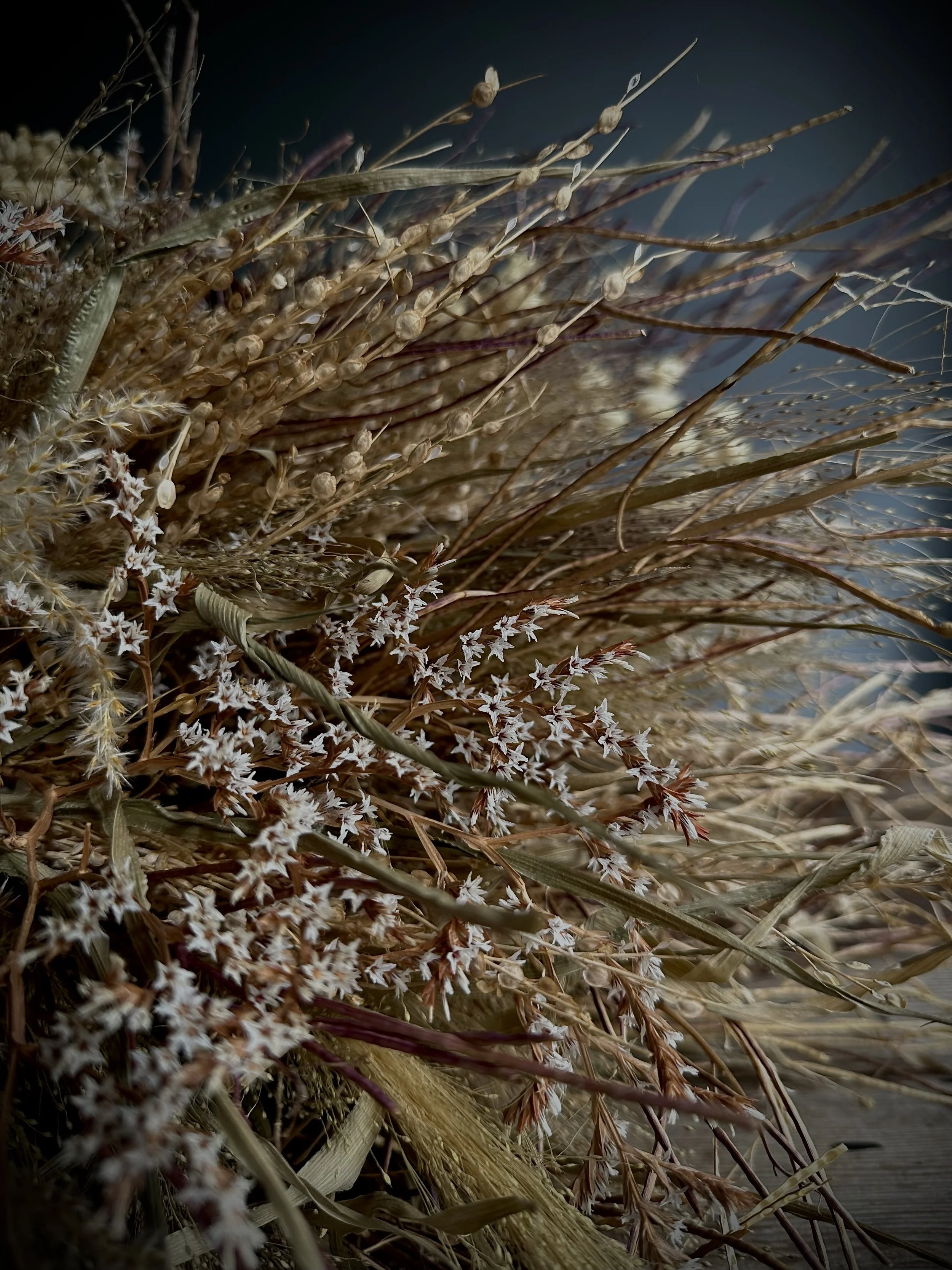Sculptural floral headpieces, formed from dried botanicals. Composed in quiet abundance, with attention to height, balance and presence. Designed to endure.
